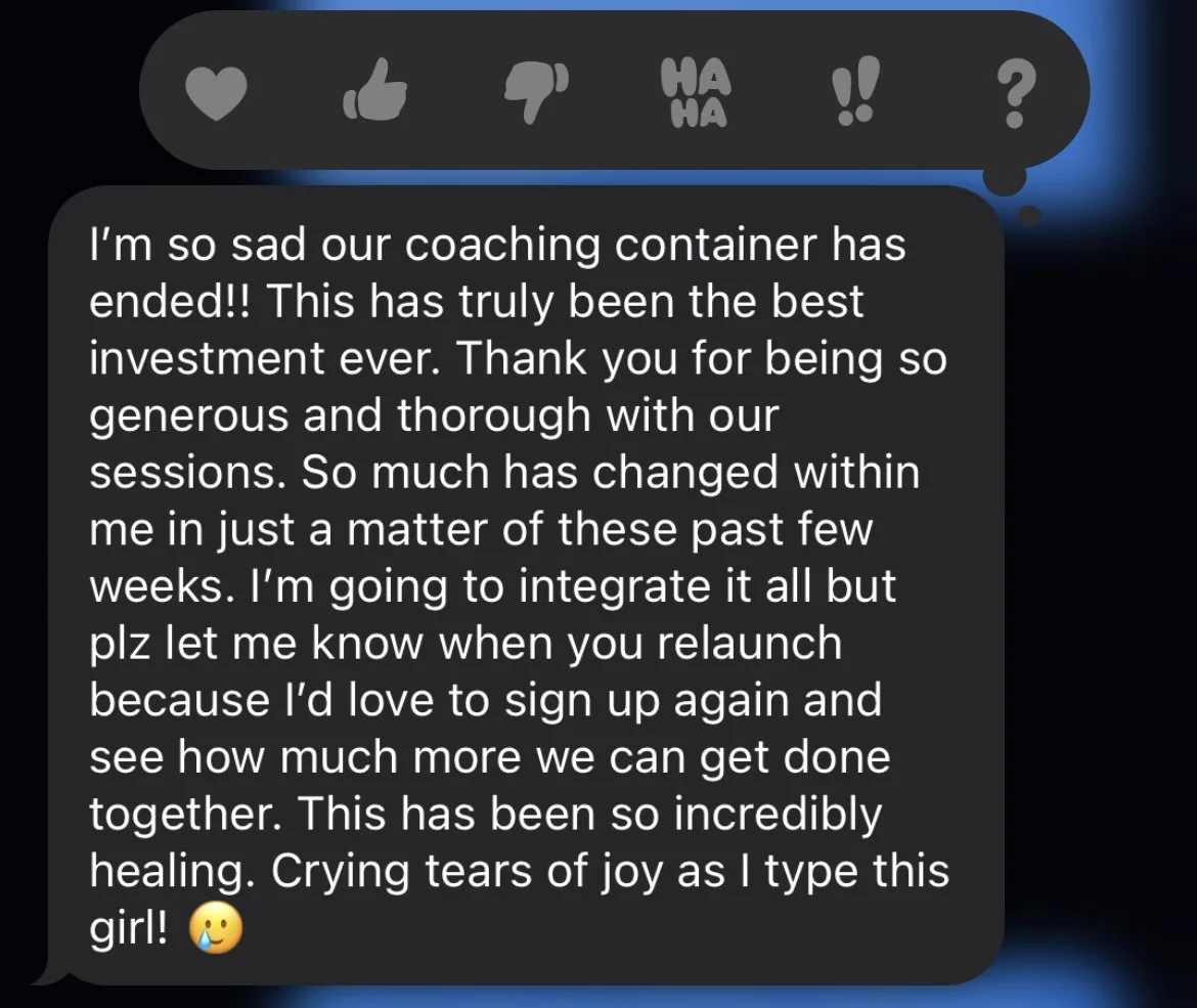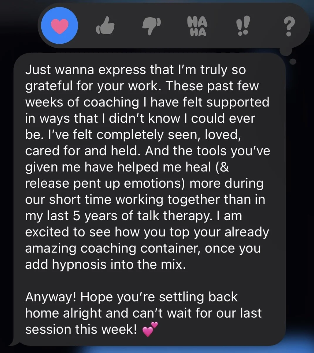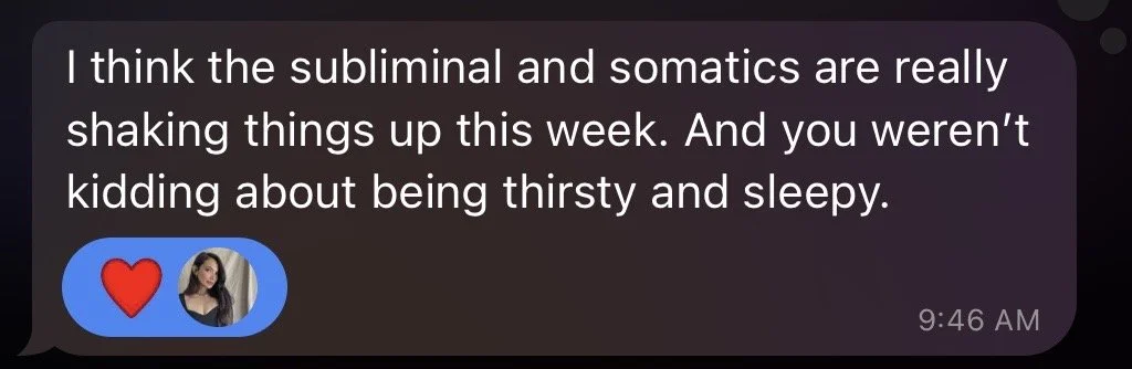 + Advanced somatic techniques and trauma-informed coaching personalized for your journey (including somatic parts work, subliminal audios, hypnosis, somatic exercises, and more)